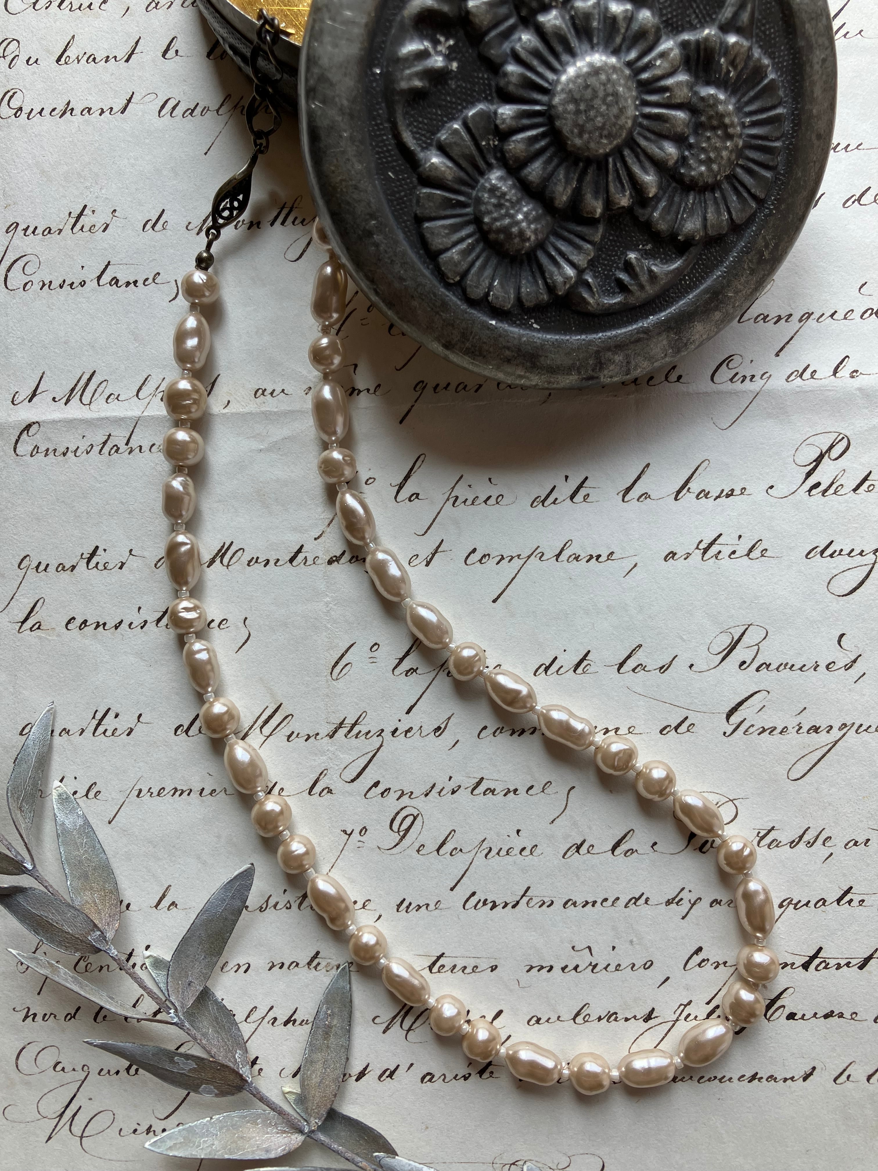 ◇フェイクパールだからこそ、自然界にない色味(ピンクベージュ)にしました。少しだけ短めの長さなのでお洋服の襟ぐりに合わせてアジャスターで長さを調節してお使い下さいませ。