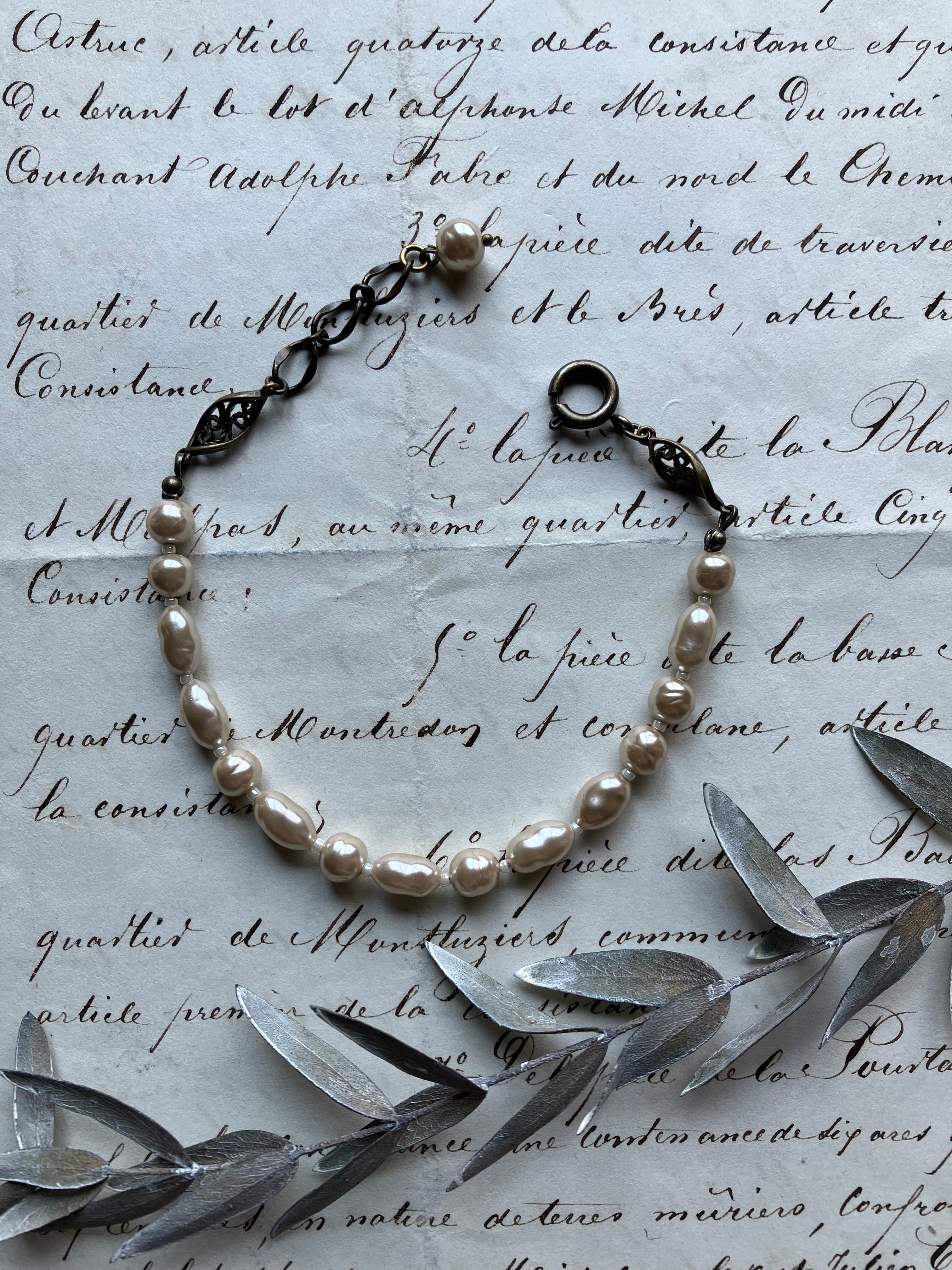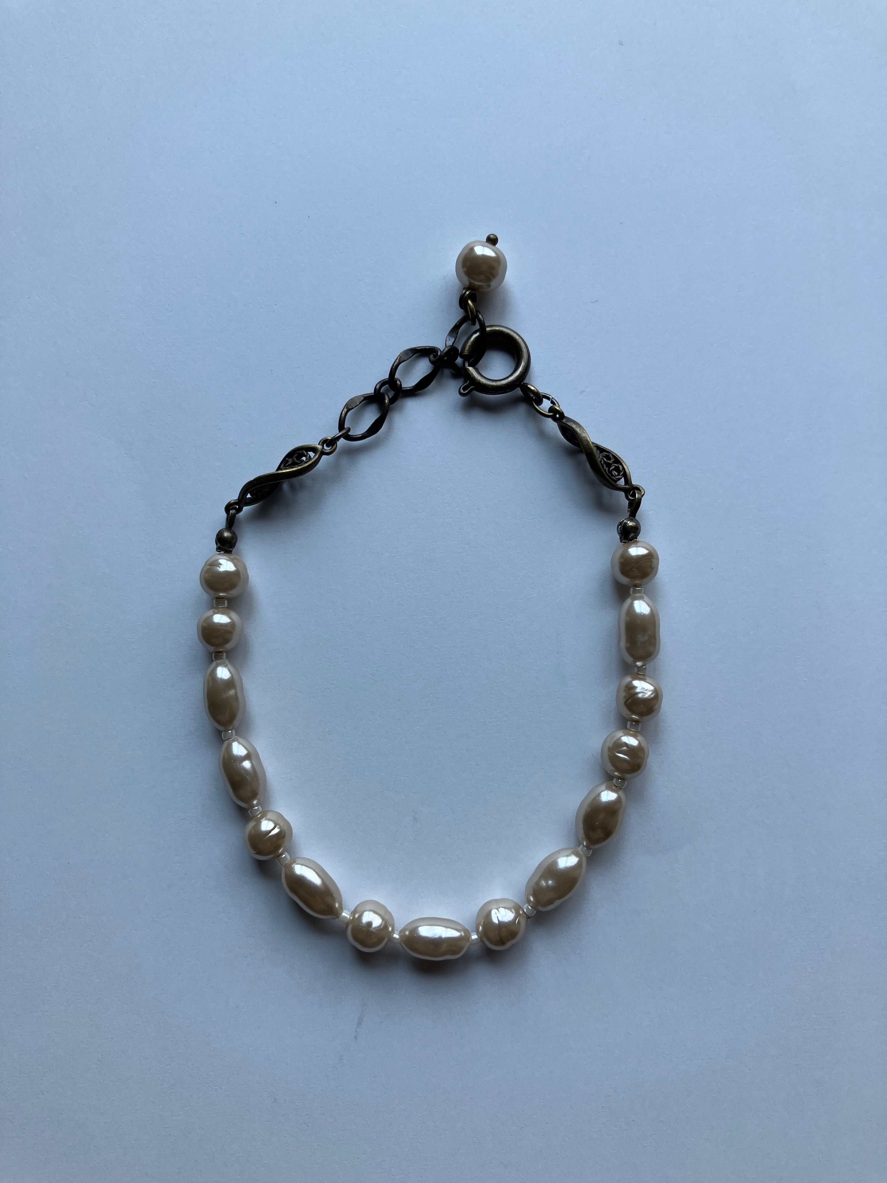 ◇フェイクパールだからこそ、自然界にない色味(ピンクベージュ)にしました。ご自身の腕に合わせてアジャスターで長さを調節してお使い下さいませ。