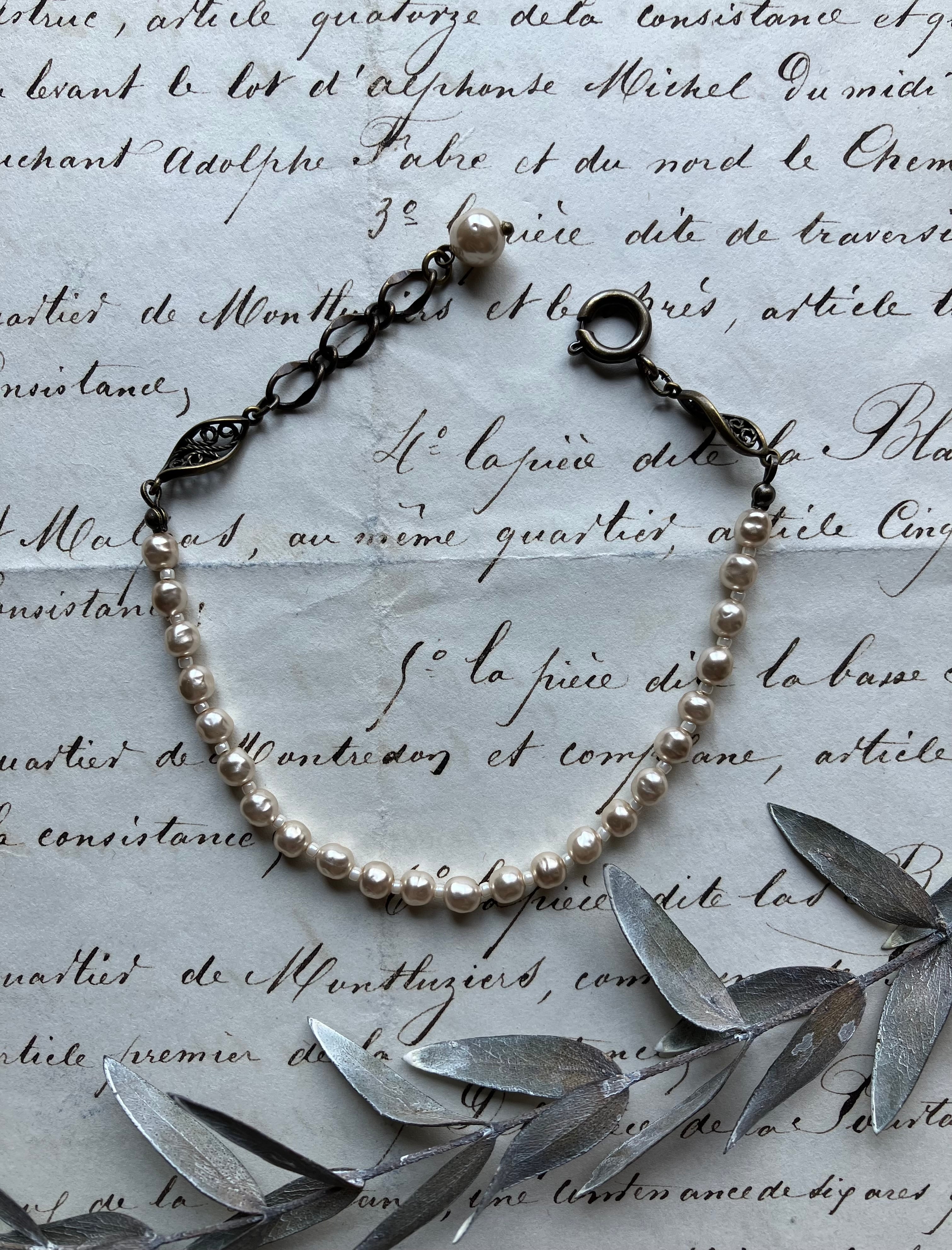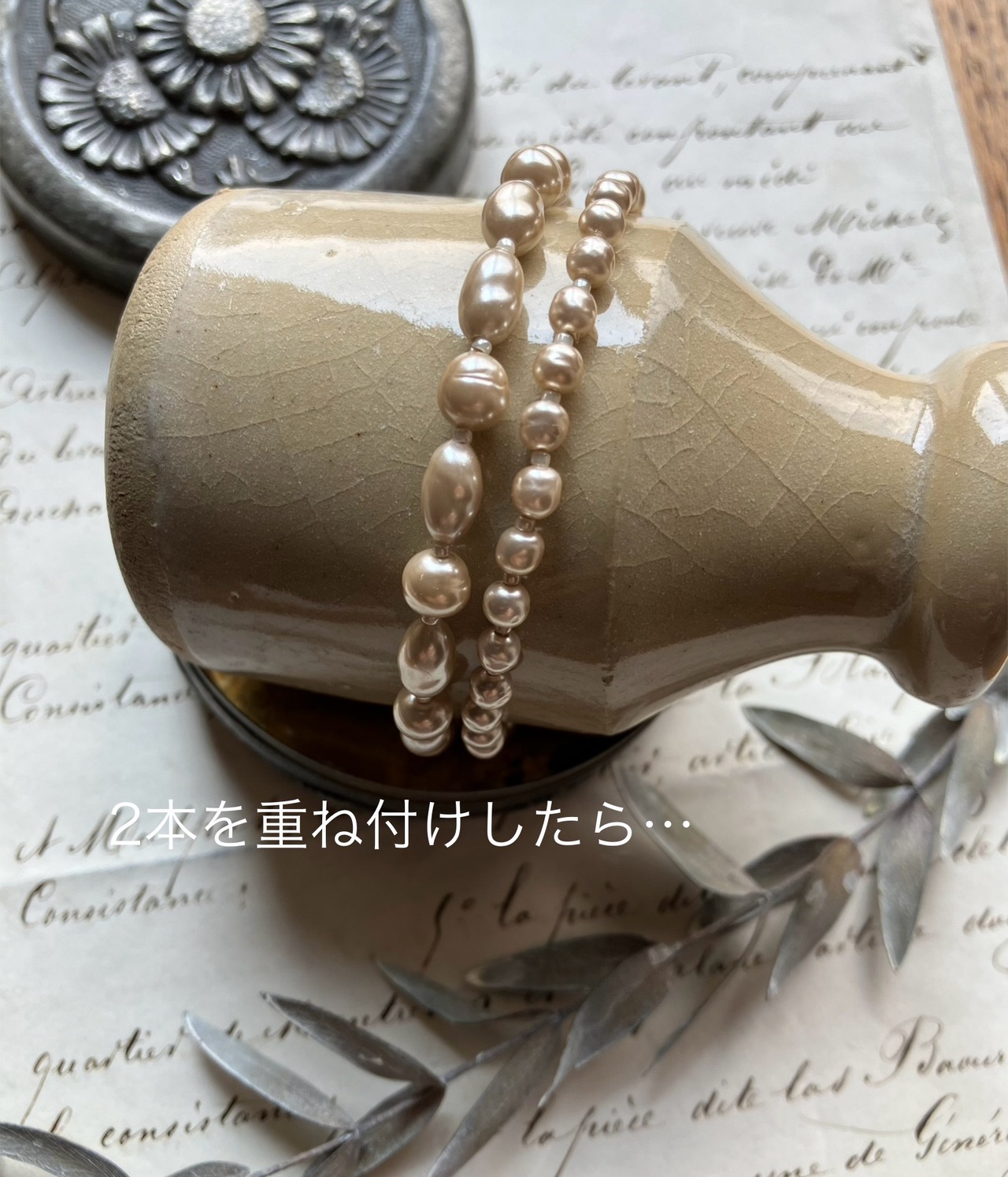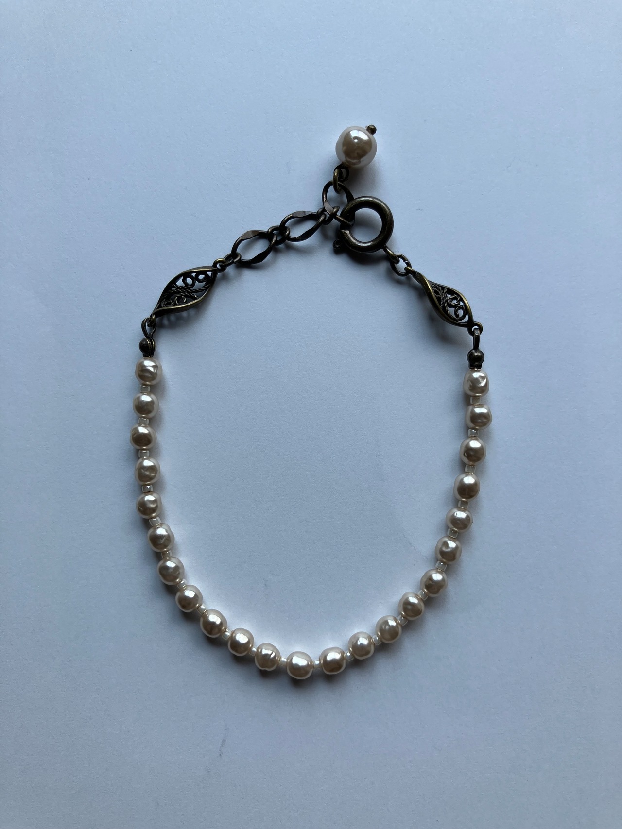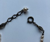 ◇フェイクパールだからこそ、自然界にない色味(ピンクベージュ)にしました。ご自身の腕に合わせてアジャスターで長さを調節してお使い下さいませ。